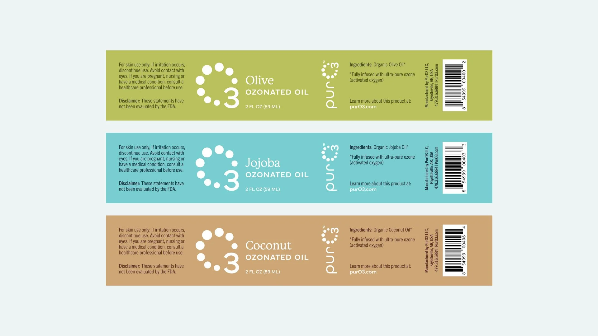 In development: Identity and packaging for PurO3, an activated oxygen wellness brand seeking to broaden their client base and reach a wider market.