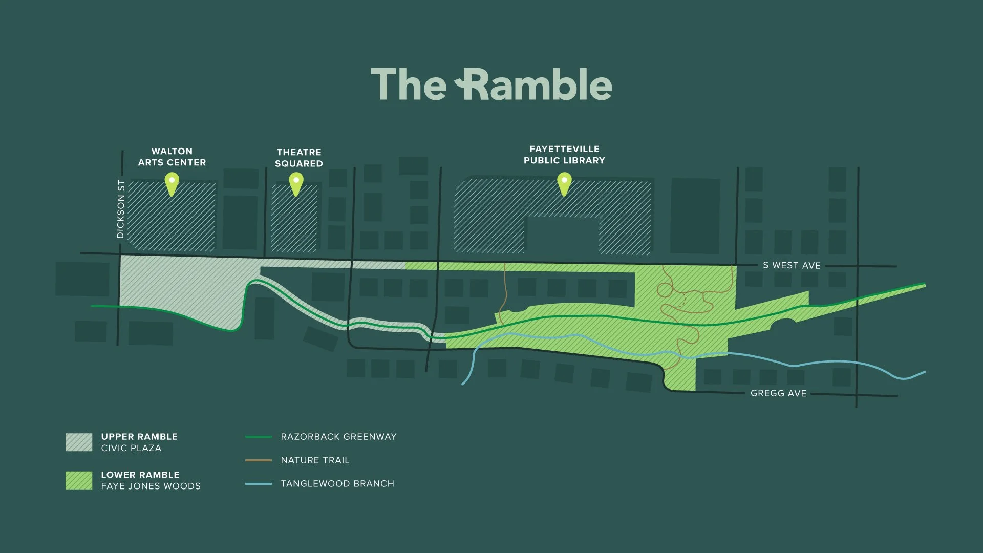 The Ramble is a refreshing reminder that tranquility can be found right in the heart of Fayetteville. Its paved, multi-use trail and greenspace seamlessly connects downtown into nature — fostering a space for community and curiosity.